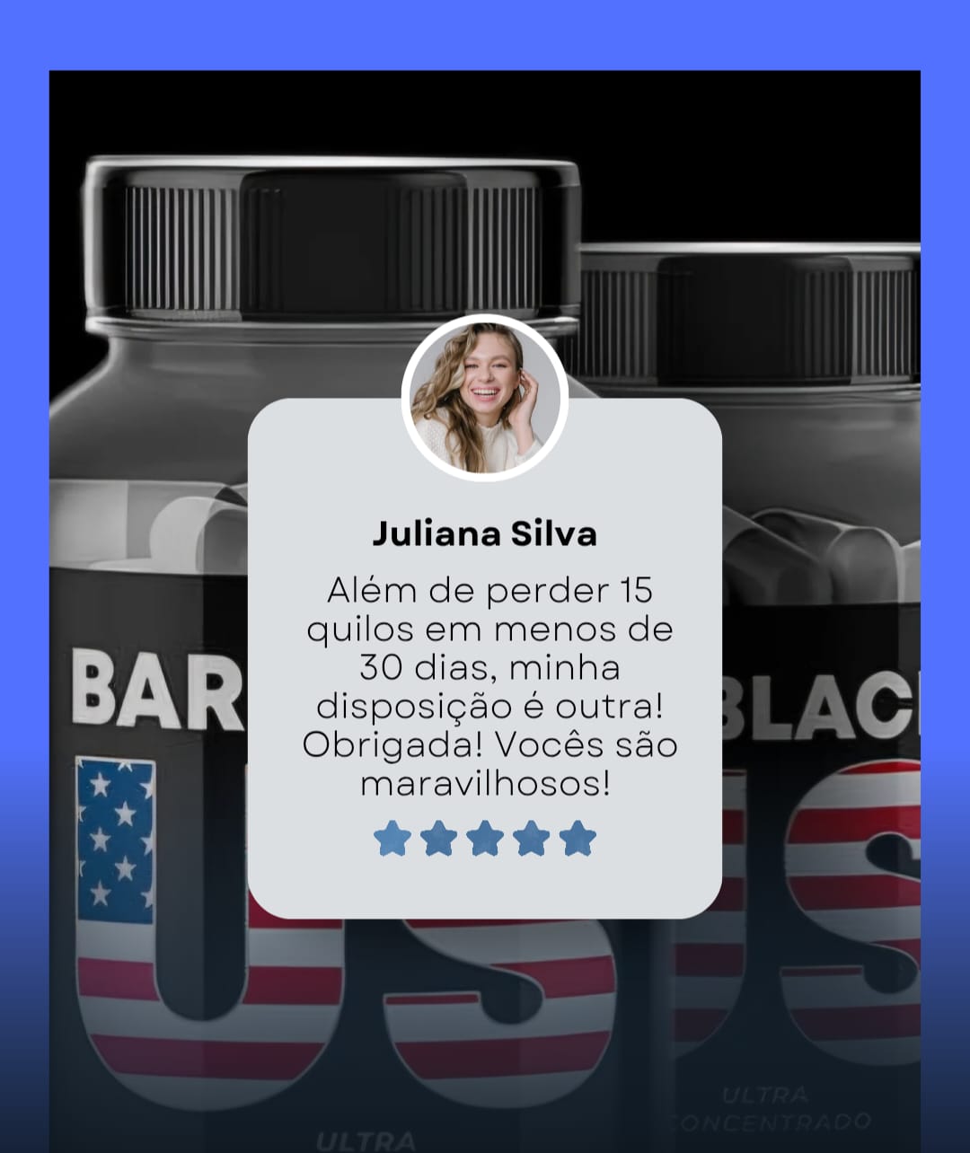 BARIBLACK é composto por Espirulina, Cromo, Psyllium, Quitosana, Cafeína e Laranja Moro.